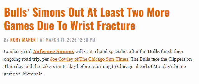 多诺万几周前曾表示,球队暂不考虑为西蒙斯进行手术,当时他提到若赛季结束后骨折仍有影响,手术可能会成为选项。这位昔日首轮秀已因伤缺席公牛最近8场比赛,且至少还将再缺阵2场。
