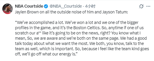 布朗说道:“我们已经取得了很多成就,赢下了很多比赛,而且我们是联盟里关注度很高的组合,更何况我们效力的是波士顿凯尔特人。所以,哪怕我们其中一人稍微有点小动静,都会被拿来上新闻,你懂我意思吧?”