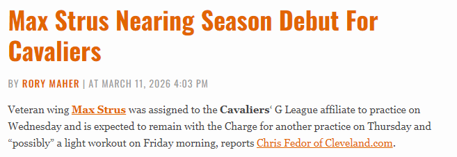 北京时间3月12日,据骑士队记Chris Fedor报道,斯特鲁斯已被下放至骑士队下属发展联盟球队进行训练,预计他周五将继续随充电人队训练,且“有可能”在周六上午进行轻度训练。