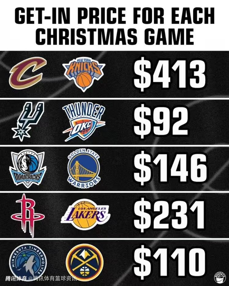 北京时间12月25日,美媒Buckets今日公布了明日NBA圣诞大战5组对决的最低票价,尼克斯主场对阵骑士的比赛最低票价也要413美元,排名第一。