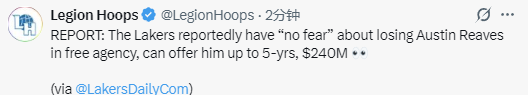 北京时间3月12日,根据Lakers Daily报道,湖人队计划在今年休赛期,一旦完全自由球员市场开启,就为里夫斯提供一份5年2.4亿美元的合同。
