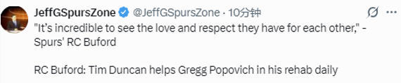 布福德说道:“波波维奇康复路上最让人动容的一点是,邓肯每天都会和他一起在球馆里,当吉诺比利、帕克和迪奥从外地回来时,他们也会天天陪在他身边。能看到他们之间这样的情谊与尊重,真的太不可思议了。在我看来,这恰恰体现了我们球队内部与众不同的关系与情感纽带。我不认为还有多少支球队能做到这一点。”