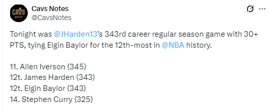 根据数据统计显示,这是哈登常规赛生涯第343场砍下30+,追平了埃尔金-贝勒,并列排在NBA历史第12位。目前在该榜单上排在哈登身前的名宿是艾弗森,后者常规赛生涯共345场比赛砍下30+。
