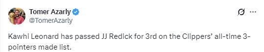 根据数据统计显示,凭借这2记三分球,莱昂纳德在快船生涯的三分球总命中数达到675个,超越了JJ-雷迪克(674),升至队史第三位。目前排在莱昂纳德身前的快船名宿是皮亚考斯基,他的快船生涯总计命中了738个三分球。快船队史三分球命中纪录的保持者是保罗-乔治,他在快船队效力时总计命中了820个三分球。