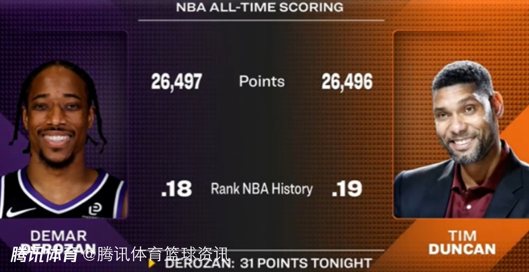 本场比赛之前,德罗赞生涯总得分为26466分,前三节战罢,他已经拿到本场比赛的第31分,这样一来,他也超越了拿到26496分的邓肯,升至历史第18位,排在第17位的是多米尼克-威尔金斯(26668分)。