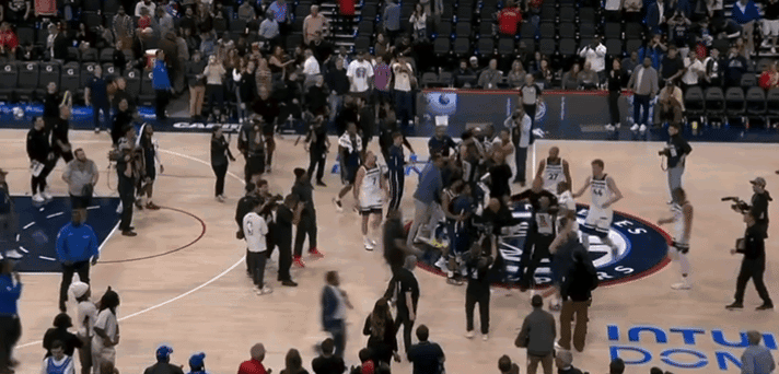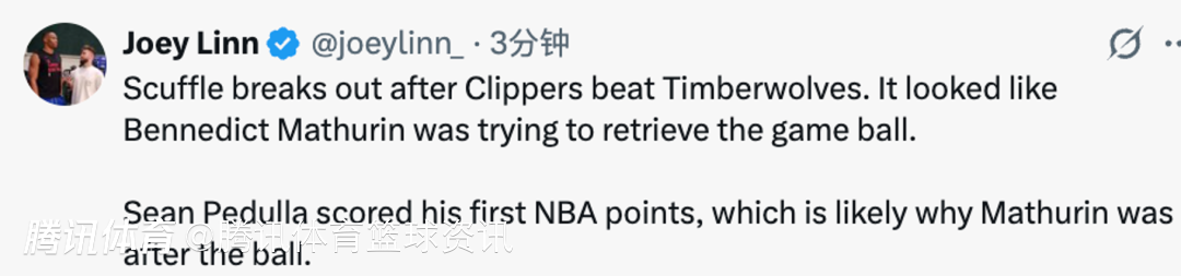 在裁判吹响全场比赛结束的哨音后,两边球员突然围成一团,镜头给到了快船球员马瑟林,似乎他和森林狼球员发生了口角冲突,但之后冲突并没有进一步发酵,两边球员也就此“散会”。据快船队记Joey Linn报道,因为快船球员佩杜拉拿到了NBA生涯首分(此役进账6分),马瑟林想要把球拿到,送给佩杜拉,之后和森林狼球员发生冲突。