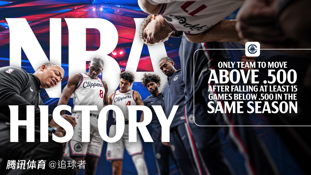 本场比赛之后,快船战绩来到33胜32负,正式超越5成胜率;快船在去年12月19日战绩一度跌至6胜21负,随后强势北伐并且豪取27胜11负,快船成为NBA历史首支在单赛季从落后5成胜率至少15场的情况下胜率回到5成以上的球队。