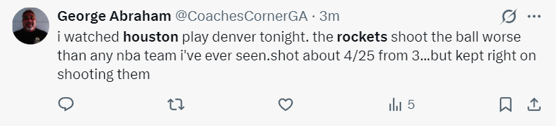 这场比赛火箭的惨败让很多记者、媒体对这支球队的前途产生了质疑,美记:我全程观看了这场比赛,火箭的投篮表现是我见过任何一支NBA球队最差的,他们三分球25中4后还在不停出手三分打铁。