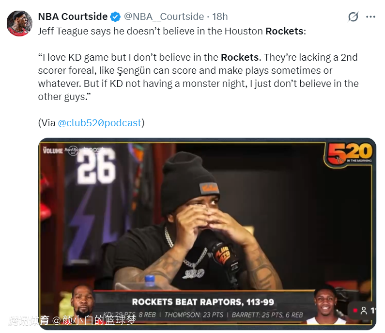 前NBA球员蒂格:我喜欢看杜兰特的比赛,但我并不看好火箭。他们缺少了一个能独当一面的第二巨头,像申京这样的球员只能偶尔贡献。一旦杜兰特无法打出超水平的表现这支球队就没有真的值得信任的球员了。