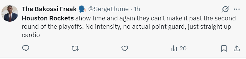 美记:火箭一次又一次的证明了他们无法再季后赛中走得更远,整支球队缺乏激情,没有出色的控球后卫,只是单纯的拖体能罢了。