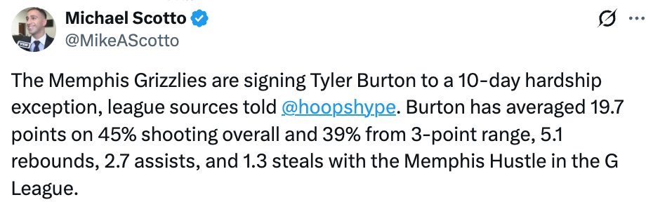 去年9月份,当时灰熊曾经和伯顿签下了一份EX10合同,但在10月份,球队为了签下小查理-布朗,从而裁掉了伯顿,之后伯顿去到了灰熊G联盟附属球队孟菲斯拼搏队。