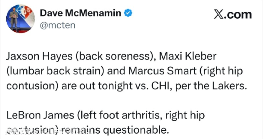 北京时间3月13日,今天上午10点30分,湖人将坐镇主场对阵公牛,湖人官方更新了本场比赛的伤病报告。