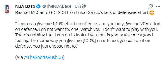 北京时间3月13日,前NBA球员麦坎茨在直播节目中谈到湖人球星东契奇的防守表现,批评他防守态度消极。