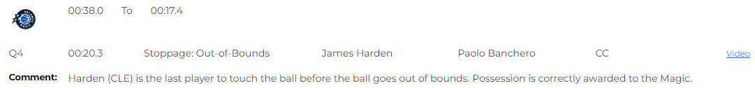 值得一提的是,裁判报告还提到了比赛最后时刻关于争议出界球的吹罚,报告显示,球出界前最后触球的球员是骑士队的哈登,球权正确判给魔术队。而在昨日的比赛中,哈登曾表示“愿拿命保证是对方触球导致出界的。”但当时骑士队没有挑战次数了,导致他们无法挑战。