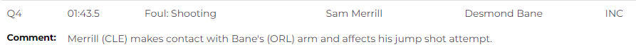 第1次漏判出现在终场前1分43秒,骑士队的梅里尔接触到了魔术队球员贝恩的手臂,影响了他的跳投出手,应被吹罚犯规。