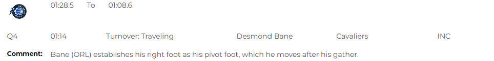 第2次漏判出现在终场前1分28秒,贝恩确立右脚为中轴脚,在收球后发生了移动,这一球应吹罚贝恩走步。