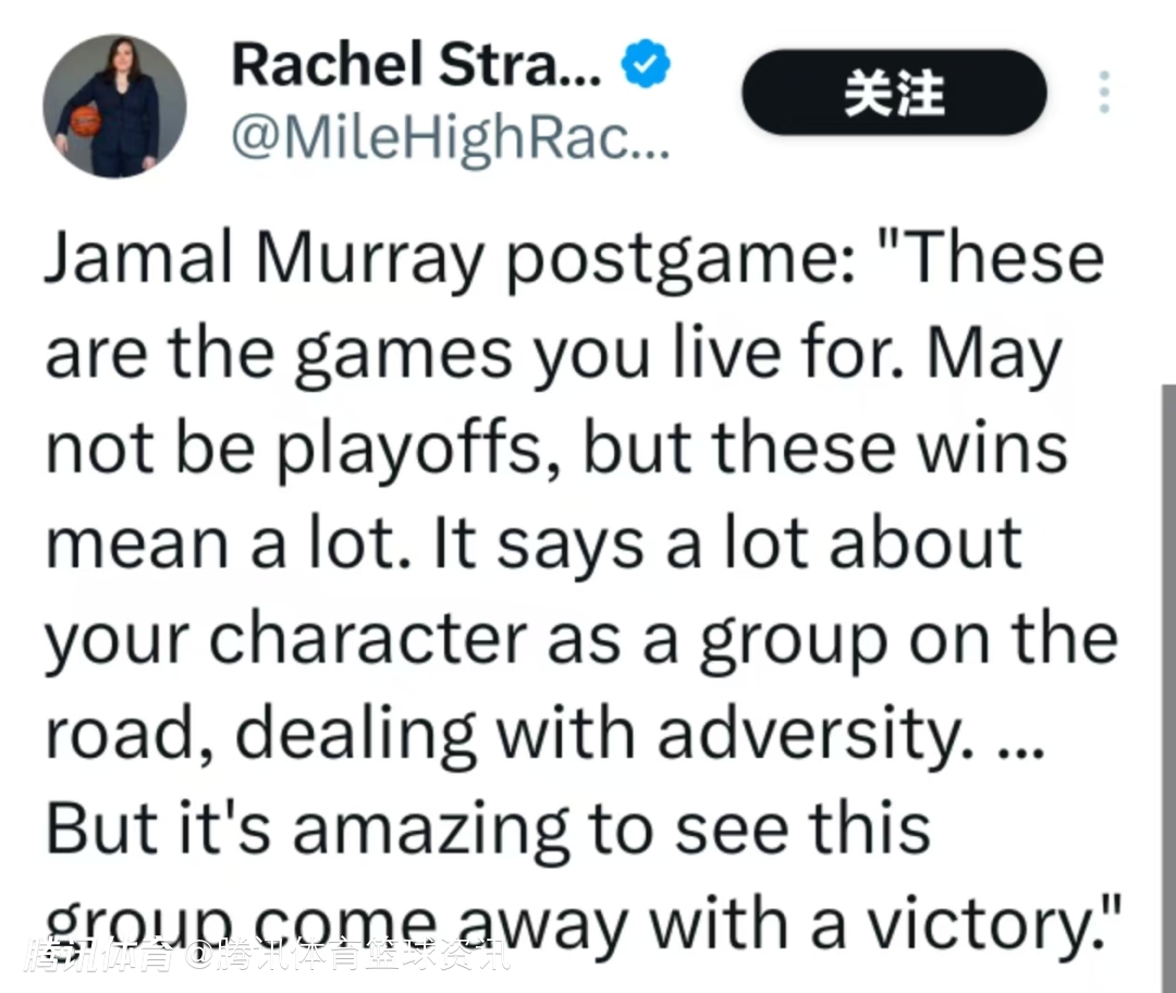 穆雷说道:“说真的,太爽了,是真的开心。这种时刻就是你打球的意义所在,这种比赛就是你为之奋斗的比赛。虽然不是季后赛,但你也知道,这样的胜利意义重大,也非常能体现一支球队的风骨和韧性。在客场作战,面对各种困境、不顺——那些细节你们不用知道,但能看到这支球队最终拿下胜利,真的太了不起了。”