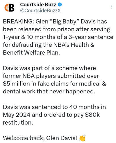 此前,格伦-戴维斯曾参与了一起集体诈骗案,多名前NBA球员联手提交总额超500万美元的虚假医疗及牙科理赔申请,但相关诊疗均未实际发生。2024年5月,戴维斯被判处40个月监禁,并被勒令支付8万美元赔偿金。