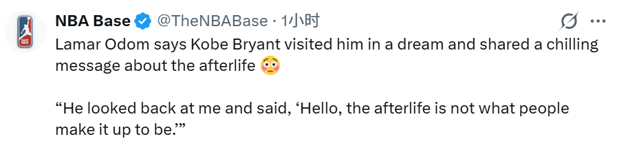 “最后那个梦特别清晰。他跟我说了一句话,我这辈子都不会忘。我们当时在比试投篮,科比投篮特别厉害,他左右脚都能起跳出手。我们走到三分线右侧45度位置,他回头看着我说:‘你知道吗,来世根本不是人们想象的那样。’”
