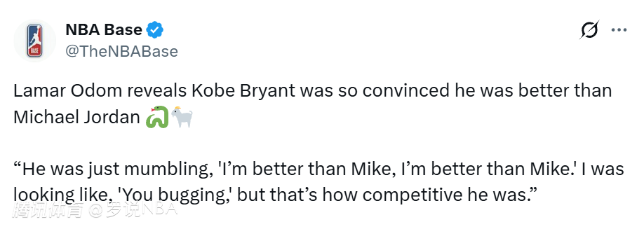 奥多姆还在节目上透露:科比当年坚信自己比乔丹更强。“他当时一直在念叨:‘我比迈克强,我比迈克强。’我当时心想:‘你疯了吧’,但他骨子里就是这么好胜。”