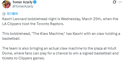 北京时间3月14日,据快船队记Tomer Azarly报道,3月26日快船主场迎战猛龙的比赛,将举办莱昂纳德摇头娃娃之夜。