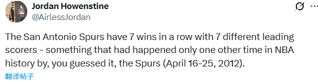 北京时间12月25日,根据马刺公关部工作人员Jordan Howenstine发布的消息显示,马刺近期豪取7连胜,且每场得分王均不同。NBA历史上此前仅出现过1次,当时也是马刺队取得如此成就(2012年4月17日至26日)。