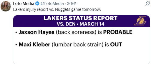 北京时间3月14日,湖人队官方公布了明日对阵掘金队的伤病报告,其中克勒贝尔缺席比赛,海斯大概率出战,具体情况如下: