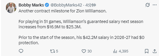 薪资专家鲍比-马克斯在个人社交媒体上写道:“锡安迎来又一项合同里程碑。由于出战满51场比赛,锡安下赛季的受保障薪水将从1690万美元升至2530万美元。本赛季开始前,他2026-27赛季4220万美元的薪水原本无任何保障。”