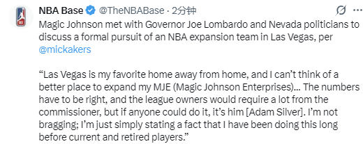 北京时间3月14日,根据NBA记者Mike Akers报道,“魔术师”约翰逊与内华达州州长乔-隆巴多及当地政界人士会面,商讨正式推进在拉斯维加斯组建NBA扩军球队的相关事宜。
