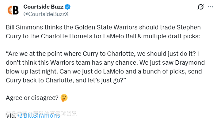 比尔-西蒙斯认为金州勇士队应该将库里交易至夏洛特黄蜂队,以换取三球和多个选秀权:“我们是不是已经到了'库里去夏洛特'的阶段,我们应该就这么做?我不认为这支勇士队有任何机会。我们昨晚刚看到追梦失控爆发,我们能不能就用拉梅洛加一堆选秀权,把库里送回夏洛特,就这么定了?"