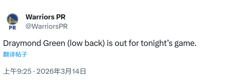 北京时间3月14日,NBA常规赛继续进行,勇士对阵森林狼。赛前,勇士官方更新本场比赛伤情报告,追梦因腰背伤势将缺席比赛。
