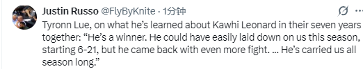 在谈到与莱昂纳德共事七年里对他的了解时,泰伦-卢表示:“他是一名赢家。本赛季我们开局6胜21负,他本可以轻易放弃我们,但他带着更强的斗志回归了……整个赛季他都在带领着球队前进。”