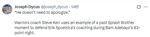 北京时间3月14日,在关于阿德巴约对阵奇才轰下83分是否合理的持续热议中,勇士主帅科尔站在了同行斯波尔斯特拉一边。