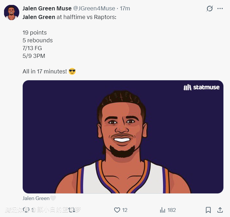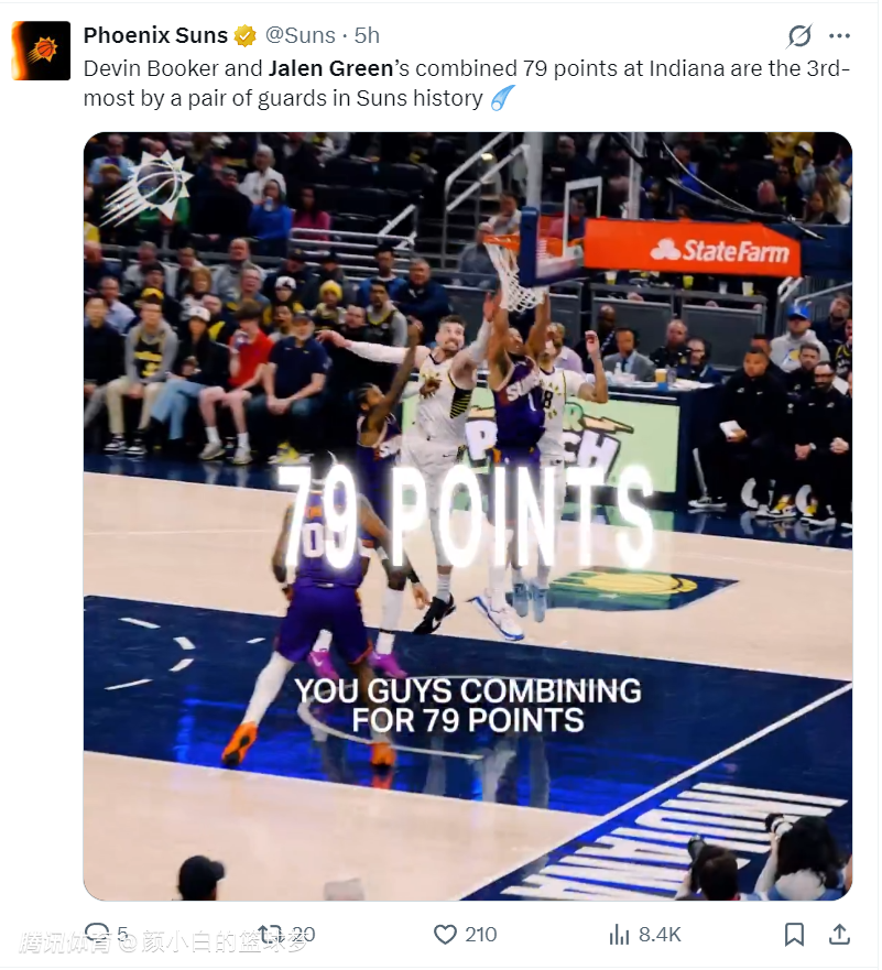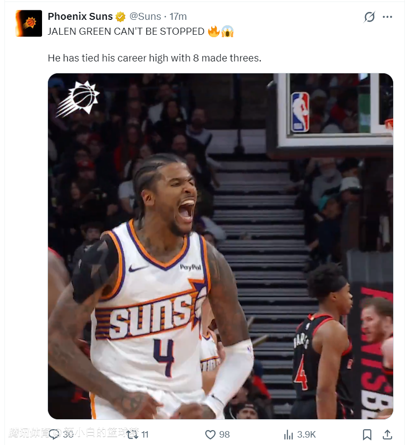 这场比赛是太阳背靠背的第二场,在昨夜太阳在步行者主场拿下大胜,布克+格林合计拿到79分,杰伦-格林拿到36分创造太阳生涯新高,他也非常意外的以超过60%的命中率拿到35+。此役背靠背第二场他延续了昨夜的出色状态,单节5中4+三分3中3拿到11分2篮板,太准了。