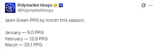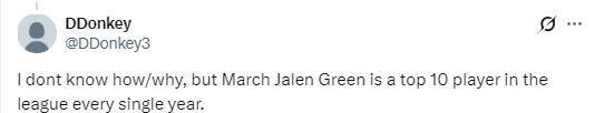 值得一提的是,杰伦-格林在三月份爆发,已经成为了他的常态。在2024-25赛季,他效力火箭队时也曾在三月份大爆发,场均轰下21.1分5.9篮板4.5助攻,还曾率领火箭队13战12胜。