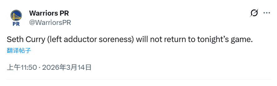 北京时间3月14日,NBA常规赛继续进行,勇士队对阵森林狼队。本场比赛进行到第三节,勇士队官方宣布,塞斯-库里因左内收肌酸痛,本场比赛将不会回归。
