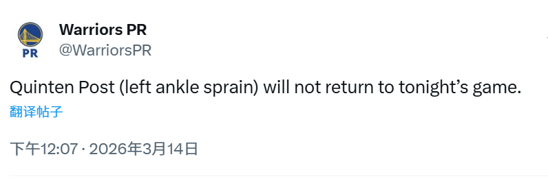 北京时间3月14日,NBA常规赛继续进行,勇士队对阵森林狼队。本场比赛进行到第四节,勇士队官方宣布,波斯特因左脚踝扭伤,本场比赛将不会回归。