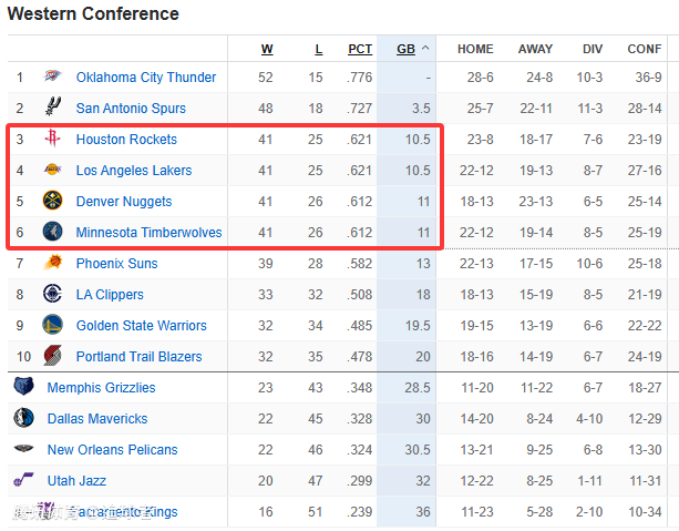 第1-6名依次为:雷霆(52胜15负)、马刺(48胜18负)、火箭(41胜25负)、湖人(41胜25负)、掘金(41胜26负)和森林狼(41胜26负)
