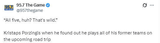 勇士队将开启一段6连客之旅,其中有5个对手是波尔津吉斯的旧主(尼克斯、奇才、凯尔特人、老鹰、独行侠,只有第4个对手活塞不是波尔津吉斯的旧主),谈到此事时,波尔津吉斯说道:“5支吗?这也太疯狂了。我也说不好如何面对旧主,最近我效力过凯尔特人和老鹰,他们可能是最了解我的球队。我会格外专注,打得更有劲头。所以,这对我们来说就是一场普通的比赛,对阵几支优秀的球队,在客场检验一下自己的实力,这会是挑战。”