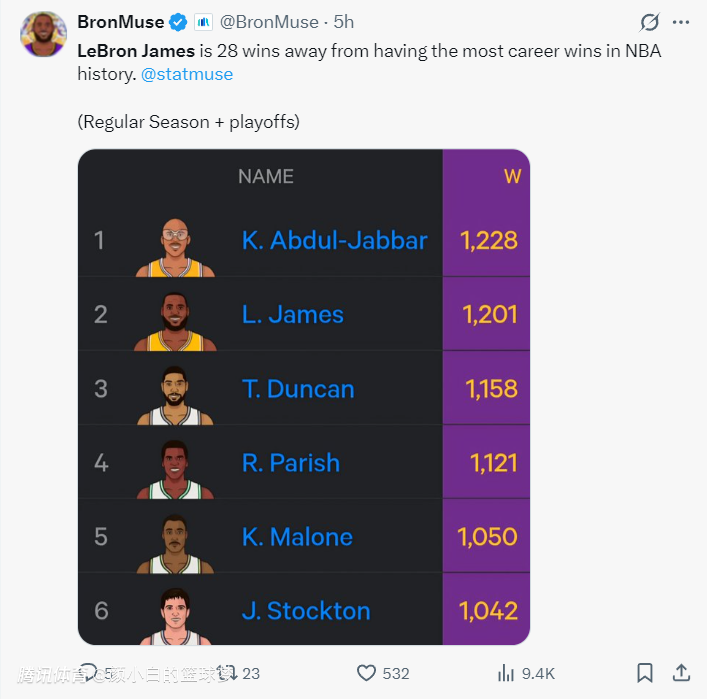 湖媒BroMuse写道,勒布朗距离NBA历史最多胜场数(常规赛+季后赛)贾巴尔只差28胜,目前詹姆斯1201胜,贾巴尔1228胜,排在第三的邓肯是1158胜。这就是征战联盟23个赛季的恐怖。