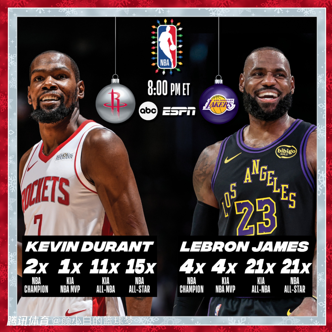 北京时间12月25日,NBA官方预热了年终大战,杜兰特与勒布朗这两位传奇巨星将第五次在年终大战中交手,前五次交手詹姆斯4胜1负占优。