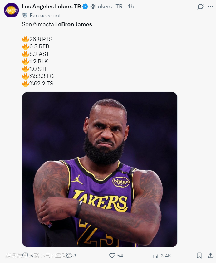 过去的六场比赛,勒布朗场均26.8分6.3篮板6.2助攻1抢断1.2盖帽,命中率53.3%,真实命中率62.2%,这哪像一个41岁的老头子?都在为詹姆斯连续1297场上双纪录终结而失落,殊不知那只是他伤愈复出适应比赛强度的方式。