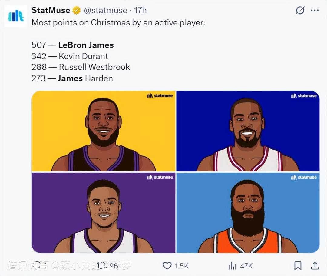勒布朗在年终大战中的得分507分就是历史第一,他每得1分就会刷新这个纪录,排在第二的杜兰特只有342分,这个差距非常之大,41岁的常青树真的不是说说而已。