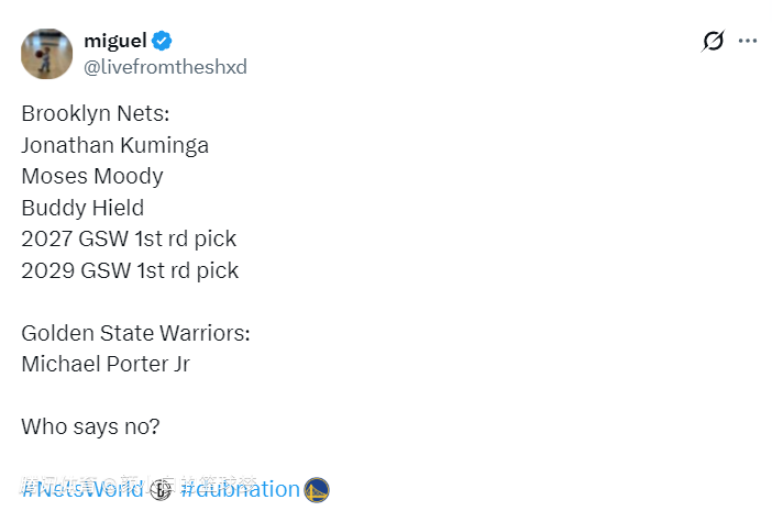 美媒Miguel为篮网、勇士设想了一笔交易方案: