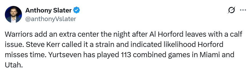 老将中锋霍福德因右小腿受伤,预计将缺席多场比赛。据勇士队记Slater透露,39岁的霍福德被确诊为比目鱼肌拉伤,塞斯-库里则是左内收肌拉伤。除波斯特出战成疑外,上述所有球员都将缺席周一对阵尼克斯的比赛。