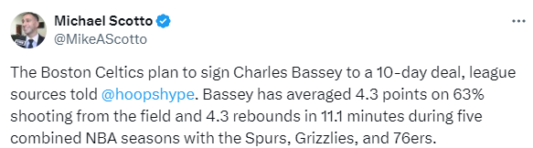 Scotto写道:“据联盟消息人士向hoopshype透露,波士顿凯尔特人计划与巴锡签下一份10天短合同。巴锡在NBA效力马刺、灰熊和76人的五个赛季里,场均出战11.1分钟,得到4.3分、4.3个篮板,投篮命中率63%。”