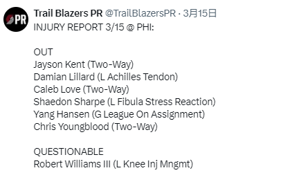 北京时间3月15日,NBA常规赛继续进行,开拓者明日对阵76人。赛前,开拓者官方公布球队本场比赛伤情报告,杨瀚森确定缺阵。