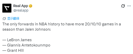 另据数据统计显示,NBA历史上,单赛季拿到20分10篮板10助攻级别三双次数比杰伦-约翰逊更多的前锋只有三位:詹姆斯、字母哥和格兰特-希尔。