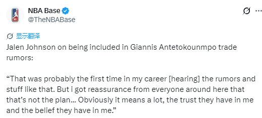 北京时间3月15日,据名记Jake Fischer报道,老鹰球星杰伦-约翰逊在谈到自己卷入字母哥交易流言时表示,他从球队得到保证并无交易意向。