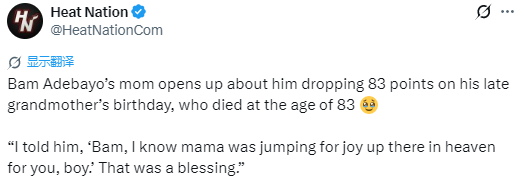 阿德巴约不仅照做了,还交出了远超预期的表现。他在周三的凯塞亚中心狂砍83分,率领热火击败奇才,这一得分也创下NBA历史单场第二高纪录。赛后,玛丽莲的弟弟给她打了个电话,一番话让阿德巴约83分神迹刚诞生几分钟的她瞬间怔住。“他说,咱妈五年前去世时,正好83岁。” 玛丽莲回忆道。